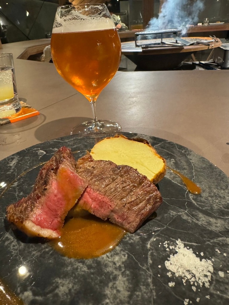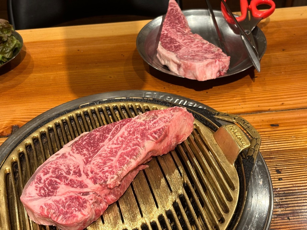 ぶ厚い肉を目の前で焼いてくれて、頃合いになると